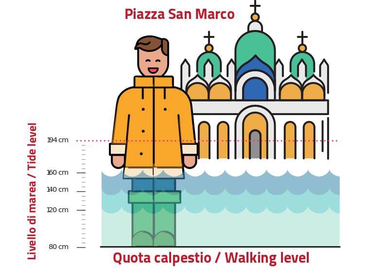 Ma quanto può essere alta l'acqua alta? Quando si misura la quota di mare, viene usato come riferimento il livello sullo zero mareografico di Punta della Salute. Per capire, la città è, nella sua quasi totalità (97%) a circa 100 cm sopra il livello del mare medio. Questo significa che la quantità di acqua che può invadere le strade è sempre ben inferiore alla massima di marea annunciata. Per fare un esempio, una marea eccezionale di 140 cm corrisponde, in realtà, a circa 60 cm di acqua nei punti più bassi della città e piazza circa il 54% del centro storico.
